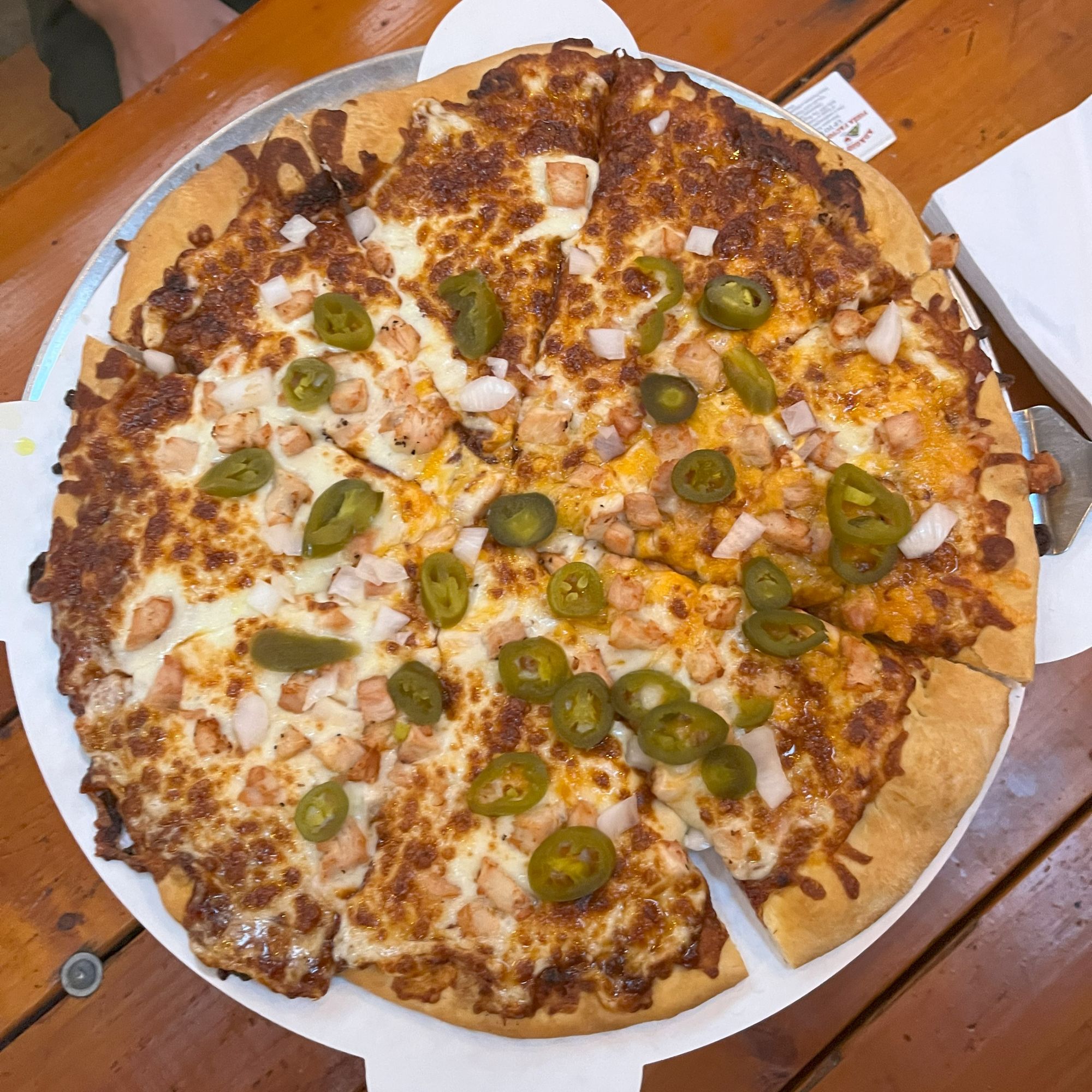Toppings: chicken, Bacon, Onion, Jalapeño, Cheddar Cheese, with our Zesty BBQ sauce and a Ranch drizzle