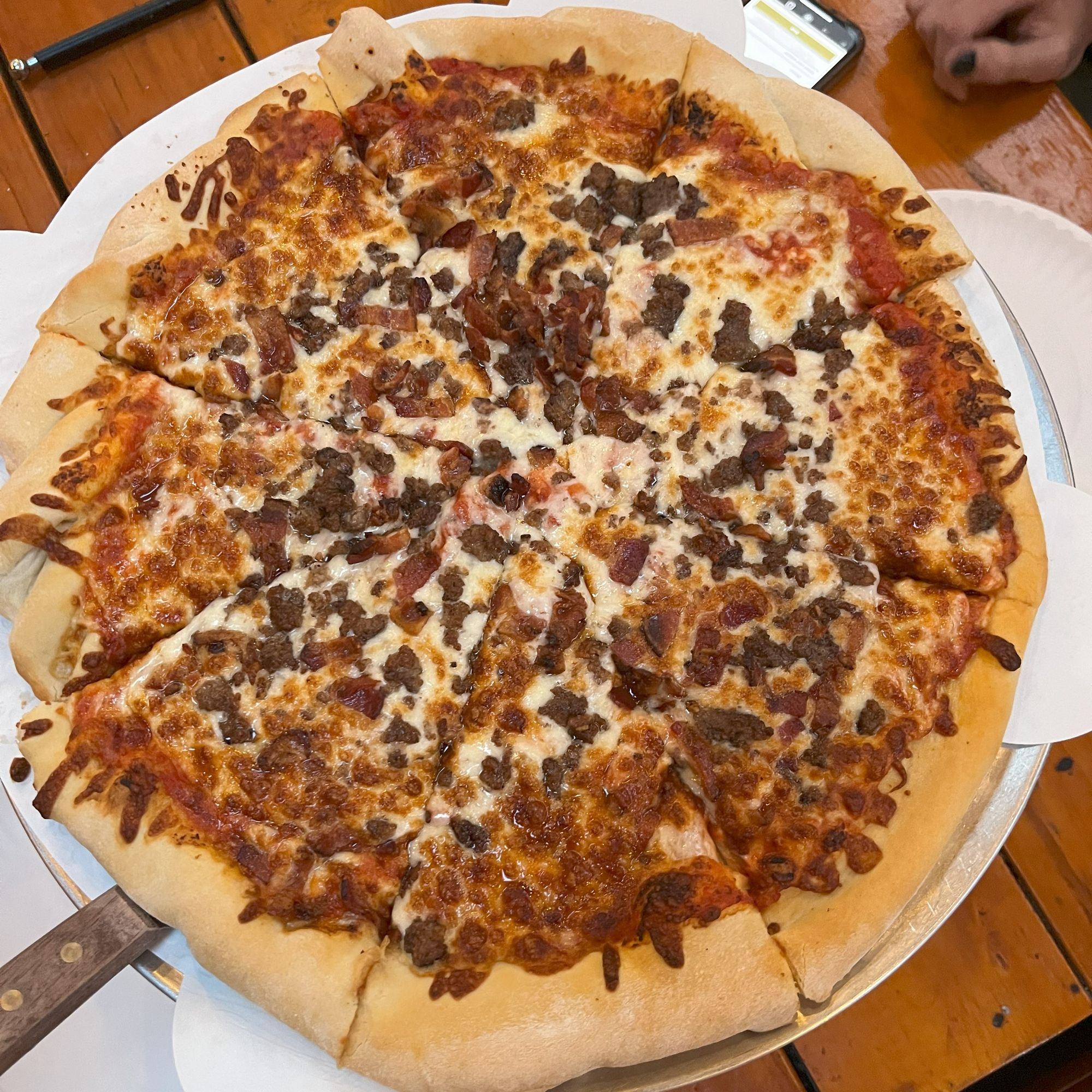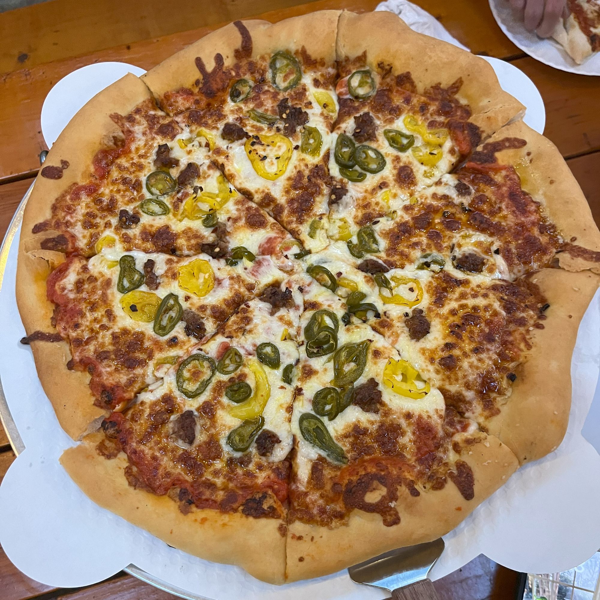 Toppings: spicy Italian sausage, banana peppers, and jalapeño with crushed red pepper