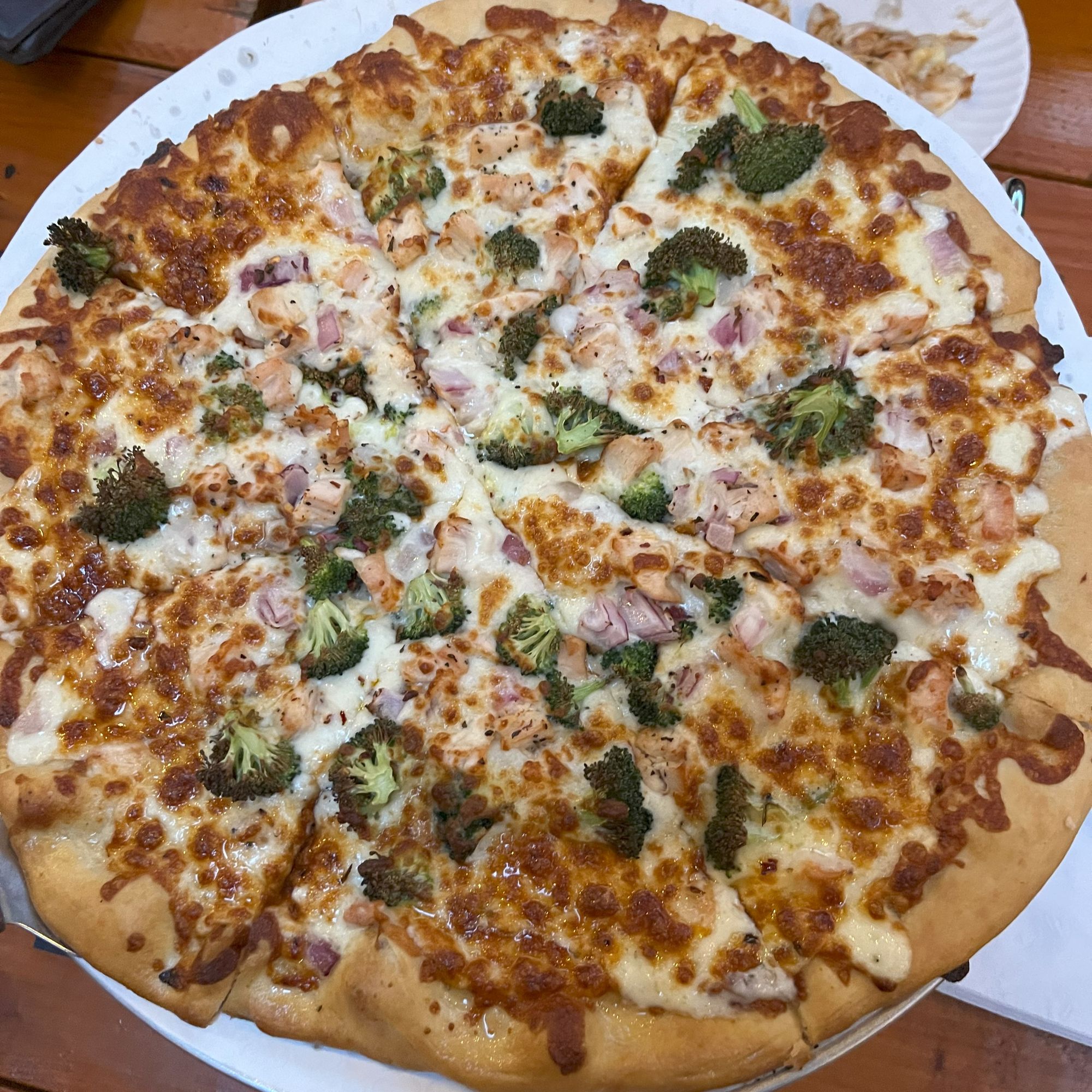 Toppings: chicken, Broccoli, Onion, Red Pepper Flakes with our creamy Garlic Alfredo Sauce