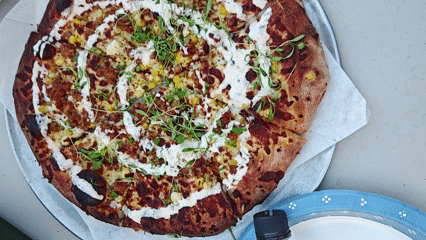 Toppings: garlic oil, local sweet corn, Might Micro Cilantro greens, queso fresco, Tajin crema, Italian sausage